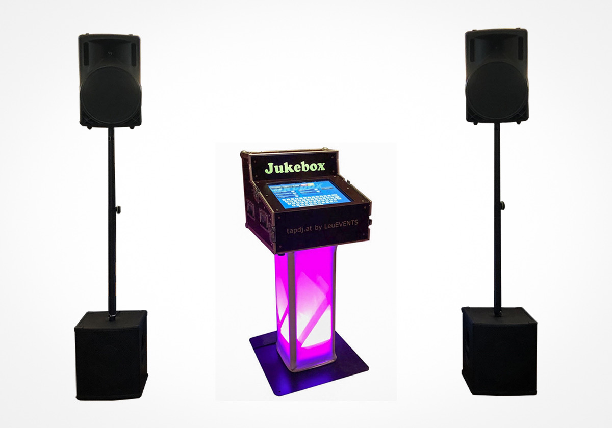 Im Grundpaket sind enthalten die Jukebox auf einer Traverse mit Ambientbeleuchtung, zwei Stück Subwoofer und zwei Stück Toplautsprecher auf einer Distanzstange und die nötige Verkabelung, sowie der Auf-/Abbau und Lieferservice bis 80km von LeuEVENTS e.U.. Es kann auch eine Lichtanlage für das nötige Ambiente dazugebucht werden.